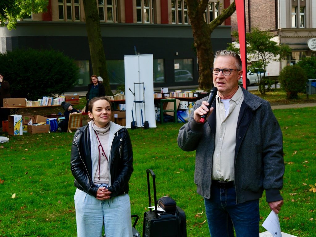 „Bücher sind Bienen, die lebenzeugenden Blütenstaub von einem Geist zum andern tragen“ In seiner Eröffnungsrede begrüßte Bezirksbürgermeister Axel Kunstmann die Besucher*innen und alle Akteurinnen und Akteure herzlich und schaffte mit dem Zitat des US-amerikanischen Autors James Russell Lowell einen kunstvollen Bogen zwischen der Traditionslocation „Amtshauspark“ und der tiefgreifenden Bedeutung von Büchern, die besonders an diesem Tag alle miteinander verband.