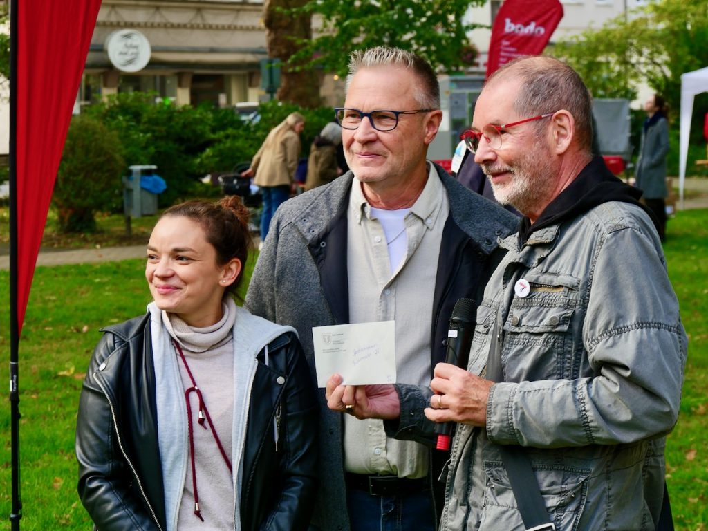 Auch der gute Zweck kam nicht zu kurz: Aus den Standeinnahmen konnte ein Betrag von 310 Euro gesammelt werden, der dem Verein MENTOR – Die Leselernhelfer Dortmund e.V. zugutekam. Vereinsvorsitzender Helmut Jüngst nahm die Spende gemeinsam mit Koordinatorin Petra Neveling dankbar aus den Händen von Bezirksbürgermeister Axel Kunstmann entgegen.