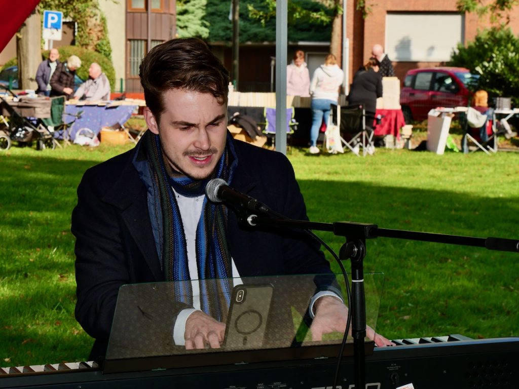 Musikalisch sorgte Pianist und Sänger Patrick Peukmann mit seinen Darbietungen für eine stimmungsvolle Atmosphäre, die das Stöbern und Verweilen auf dem Markt abrundete.