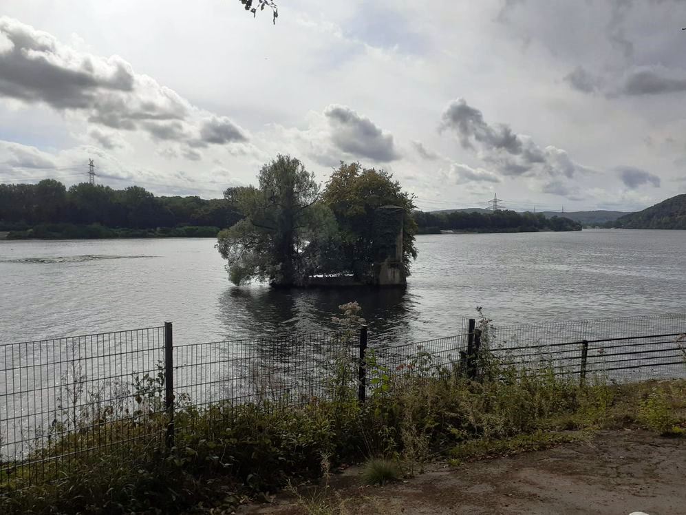 Eine erste Pause wurde an der Gaststätte „Zur Lennemündung“ eingelegt. Leider war die zu dieser frühen Tageszeit noch geschlossen, so dass die erhoffte Erfrischung mit kühlen Getränken ausblieb. Aber die Stühle des Biergartens boten genügend Platz zum Sitzen und Ausruhen. Es ging noch ein Stück am Hengsteysee entlang, dann begann der erste Aufstieg. Bei dem es aber nicht blieb, denn auf dem Weg nach Wetter gab es immer wieder Taleinschnitte, die einen Abstieg und anschließenden Aufstieg erforderten. Belohnt wurden die Wandernden von eindrucksvollen Fernblicken und Ausblicken auf den unter ihnen liegenden Harkortsee.