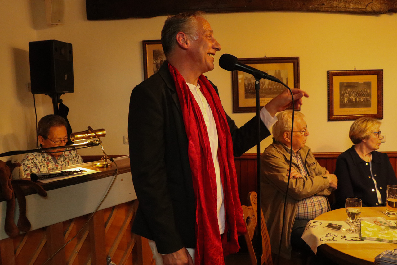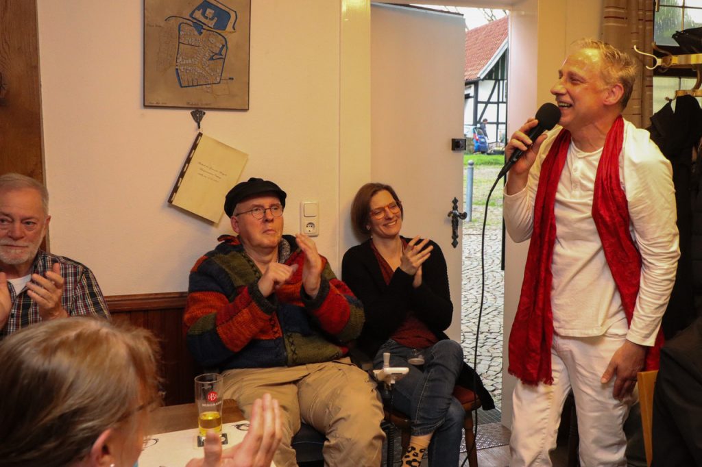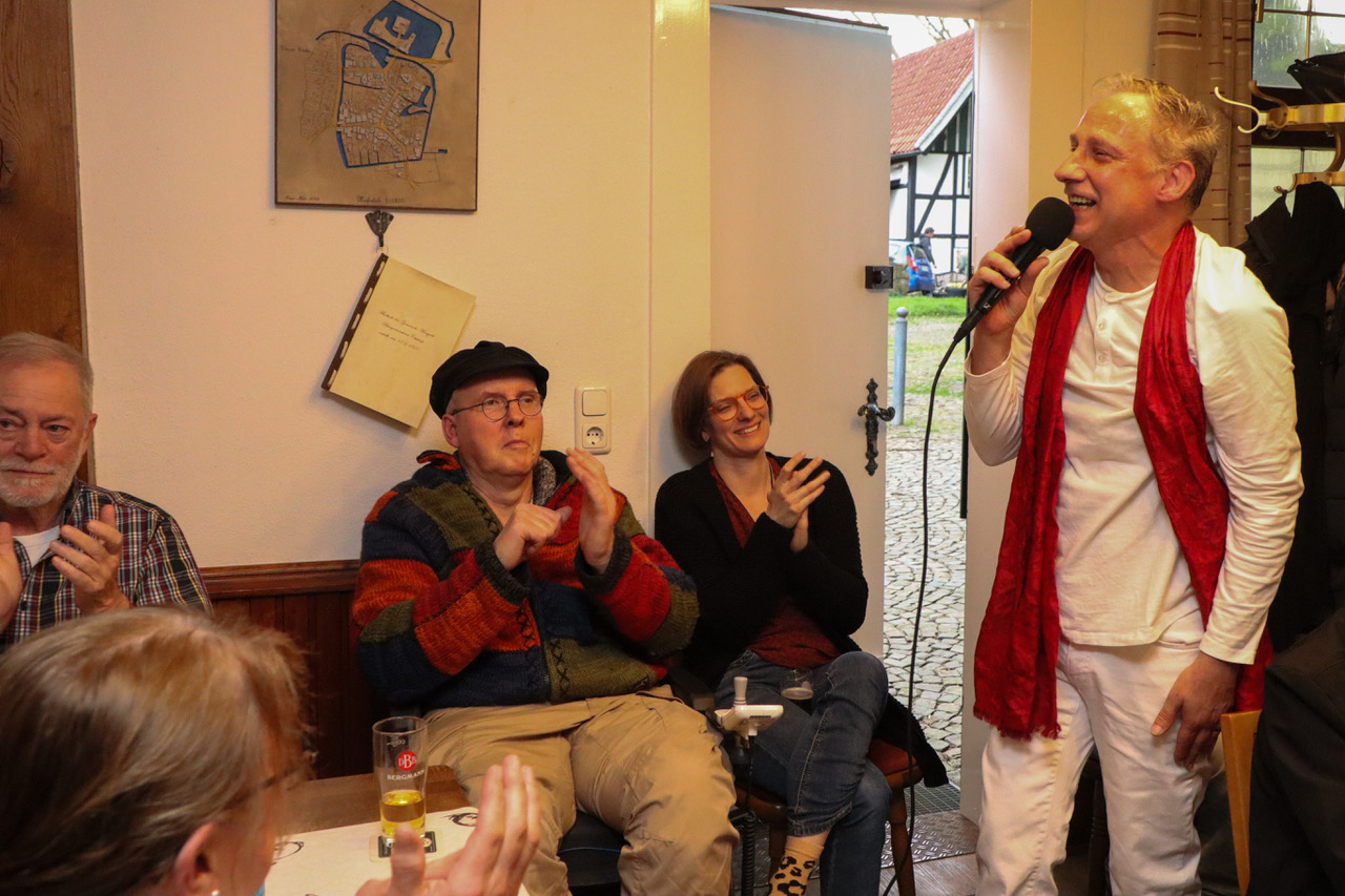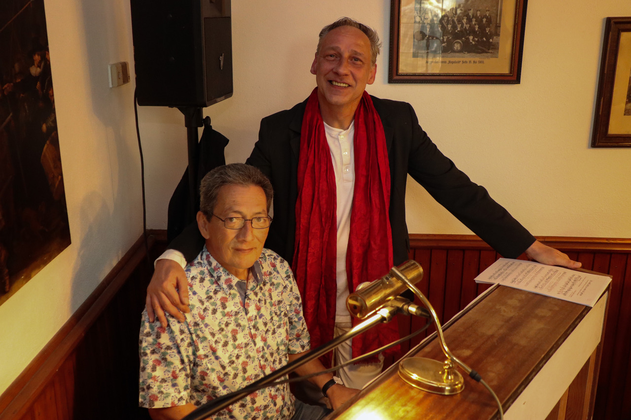Zu der April-Veranstaltung „Auf`n Pils“ hatte der Heimatverein Mengede für das halbstündige WarmUp vor Beginn der offiziellen Öffnungszeit den Neu-Mengeder und Travestie-Künstler Jörg Zadow alias Sophie White und den Pianisten Martin Heider eingeladen.