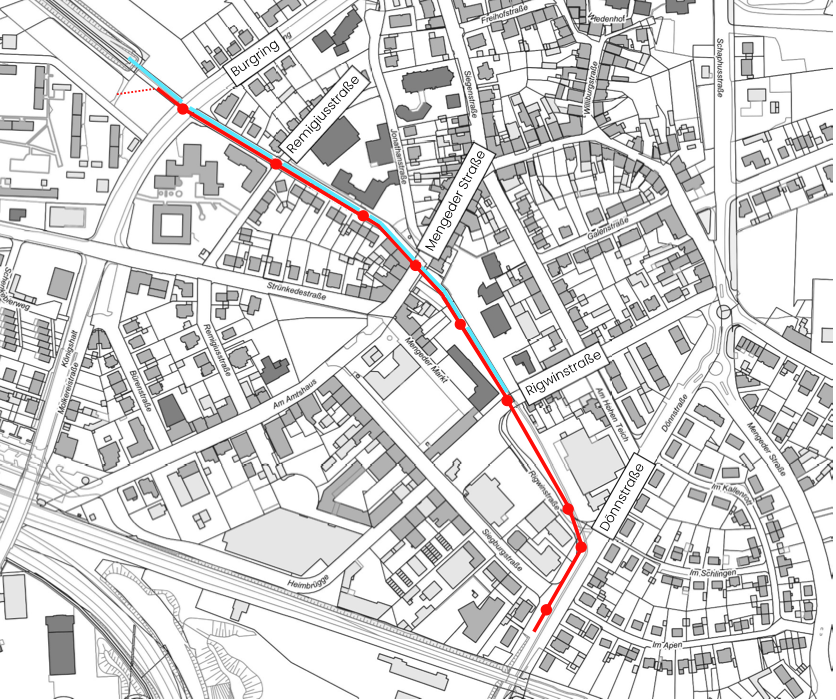 | Zwischen Dönnstraße 39 und Burgring verläuft der Abschnitt des Bodelschwingher Bachkanals, den die Stadt 2021 von der Emschergenossenschaft übernommen hat. Das unterirdische Bauwerk ist mehr als 100 Jahre alt. Auf einer Länge von rund 780 Metern wird die Stadtentwässerung den Kanal nun sanieren und fit für die Zukunft machen. Ein wichtiger Aspekt dabei: die Entkopplung des Regenwassers vom Schmutzwasser. |